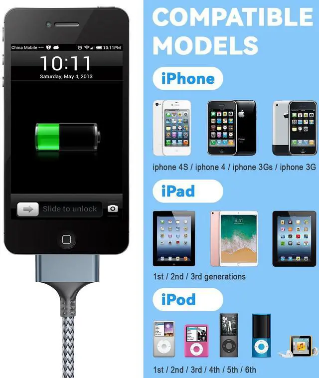 2-IN-1 Function- USB 30 pin cable supported both charging and data transfering at high speed compatible with old iPhone iPad and iPod that has 30-pin ports. (not support audio function) Widely Compatibility- 30 pin to usb compatible with iPhone 4S/4/3GS/3G iPad 1/2/3 iPod touch 1st/2nd/3rd/4th Gen iPod nano 1st/2nd/3rd/4th/5th/6th Gen iPod Classic 1st/2nd/3rd Gen and previous iPhone models. Not support any newer devices. Fast Charging & Data- Charger cable for iPhone 4 supported 2.4A fast charging no more worry about running out of power! A 1gb movie can be transfered in just 2 minutes saving your times as well! Superior Material & Quality- High-quality old iphone charger with high-density braided wire and reinforced interface exllecnt in toughness and elasticity tangle-free and easy to store.