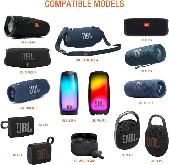 Wide Compatibility: JBL Charge 4 JBL Charge 5 JBL Charge 6 JBL Flip 5 JBL Flip 6 JBL Flip 7 JBL Pulse 4 JBL Pulse 5 JBL clip 4 JBL clip 5 JBL GO 3 JBL GO 4 jbl extreme 4 JBL vibe beam JBL Endurance Peak 2 JBL Endurance Peak 3 JBLCHARGE4BLKAM Wireless Bluetooth Speaker.