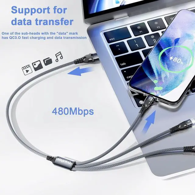 Multi USB C Splitter Cable 4FTThe multi usb c charging cable 3 in 1 is unique brings you convenience and sharing feeling. Three type-c charging head in 1 cable make the phone charger simple lightweight and portable. Moderate 4FT/ 1.2M length you can carry this multi charger cable anywhere perfect for home car office travel dock or sharing with friends. Quick Charge 3.0 and Data SyncThree ports can be fast charging one of which can also be support QC 3.0 charging function and data transmission. Its transmission speed can reach 40~60MB/S (480Mbps). The maximum output current of the other 3 ports also up to 3.1A but can't synchronize data.