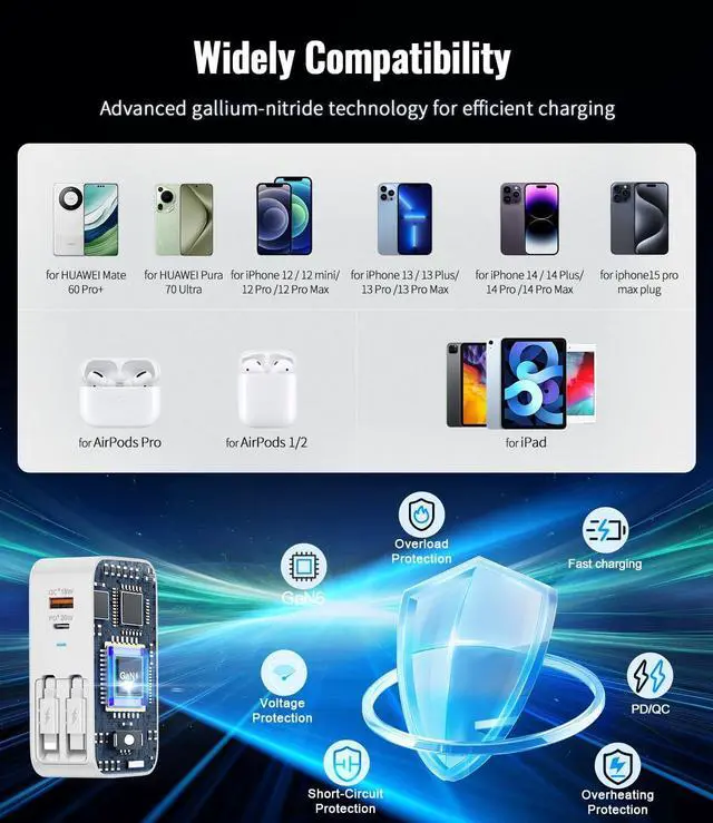 4-in-1 design2025 upgraded 4 in 1 retractable charger wall plug has built-in dual retractable cables a QC 18W usb port and a PD 20w type-c port. Its various charging interfaces can meet our daily charging needs to the greatest extent. And retractable functions can be easy to organize and carry Ideal for home office travel essentials. Revolutionary GaN6 TechnologySlow charging? overheating? The retractable charger usb c adopt high quality chips and advanced GaN6 technology materials. It generates less heat charges faster and more stable than traditional charger block. Built-in overcharge overcurrent overvoltage short circuit and other protection to protect your equipment.