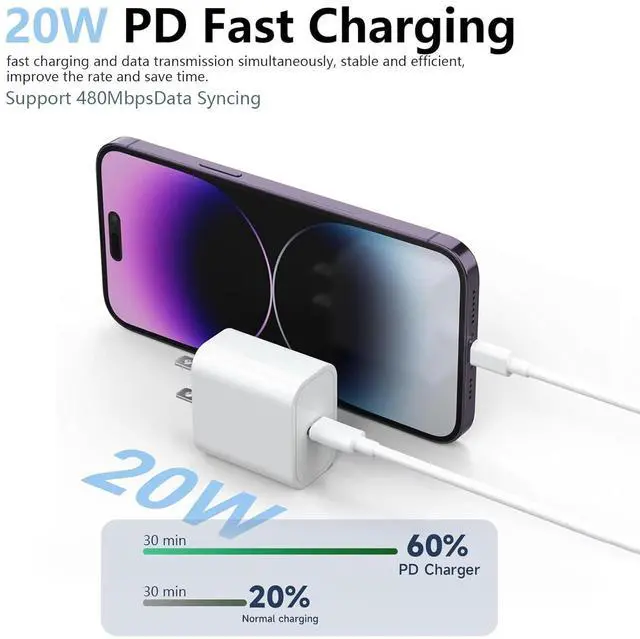 3. The MFi Certified Chip Ensures That The Cable Can output Safe and effective current for the device. Which can accept 3A current for fast charging and 480 Mbps/s fast data transmission 20W High-Speed Charging With the ability to charge up to 4 times faster than a standard 5W charger. 4. PD Port Fast Charger is designed to provide users with a quick and efficient charging experience. With the ability to charge up to 4 times faster than a standard 5W charger this technology ensures that your device can be powered up in no time.