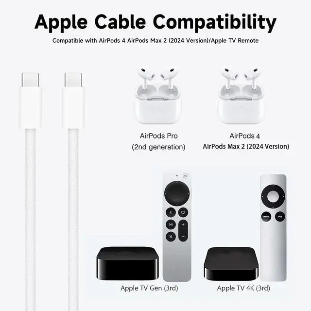 1.? Designed for (2nd generation) and AirPods 4 AirPods Max 2 (2024 Release). USB C to USB C Woven Cable for TV Remote (3rd Gen) TV Remote 4th Gen Siri Remote (3rd Gen) TV 4K Remote (3rd Gen) TV Siri 4th Gen. This Charger supports iPhone IPads Remote and AirPods headsets with USB C port. 2.? Compatible with iPhone 16/16 Plus/16 Pro/16 Pro iPhone 15/15 Plus/15 Pro/15 Pro Max iPad 10rd Gen 2022/ iPad Mini 6rd Gen 2021/ iPad Pro 12.9 inch 6rd Gen/ iPad Pro 12.9 inch 5rd Gen/ iPad Pro 12.9 inch 4rd Gen/ iPad Pro 12.9 inch 3rd Gen/ iPad Pro 11 4rd Gen/ iPad Pro 11 3rd Gen/ iPad Pro 11 2rd Gen/ iPad Pro 11 1rd Gen/ iPad Air 5rd Gen/ iPad Air 4rd Gen.
