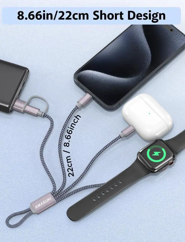 ?? Travel Essentials & 8.66 inch LengthWith lightweight and portable design this 8.66 in 3-in-2 charging cable is fit in your travel bag take it on the go or simply use at home and office charge your watch and iPhone anywhere anytime?? 3 in 2 Charging DesignThere are 6 charging ways- USB C/A to iWatch charger & USB C/A to L cable & USB C/A to Type C Cable. The multiple charger support simultaneously charge 3 devices with a USB C/A adapter ( Not included ) Compatible for all iWatch ultra series 9/SE/8/7/6/5/4/3/2/1 the L-Port is compatible with iPhone14/13/12/Pro/Max/iPad USB C is for iPhone 15/15 Pro/15 Plus/15 Pro Max Galaxy S23/ S23+/ S23 Ultra/S22/ S21/ S20/ S20+ Don't support Watch!?? Fast Full Charging Saving More TimeThis type c to L cable support fast charging up to 2A Max.