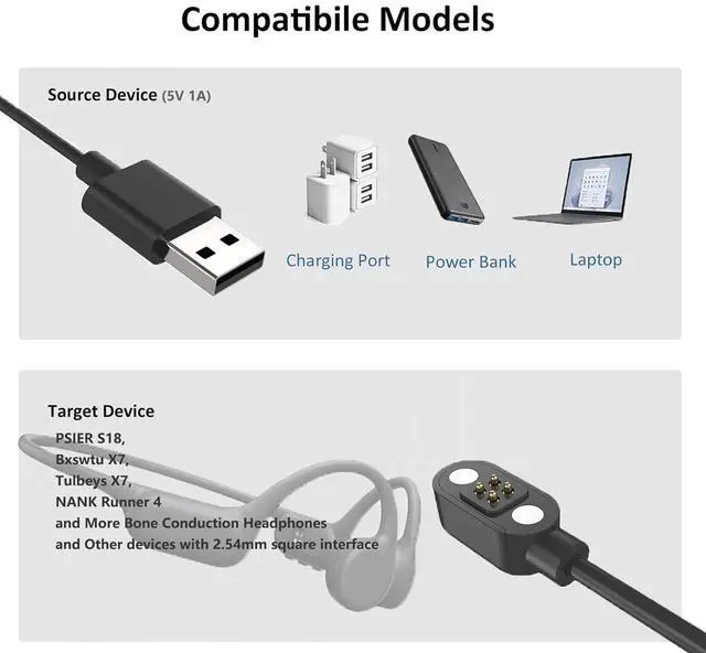 Fit forThis 4-pin magnetic charger is suitable for a variety of 2.54 mm square interface devices such as PSIER S18 Bxswtu X7 Tulbeys X7 NANK Runner 4 and more bone conduction headphones. Magnetic ChargingThe magnetic charging cable ensures a tight connection and helps align the bone conduction headphone with the charger. Plug and play no need to wait. It improves the efficiency and speed of the charger. Stable and DurableCrafted from High-quality ABS+PVC material the magnetic charger cable has been tested for bending over 5000+ times. And the copper wire does not generate heat in charging.