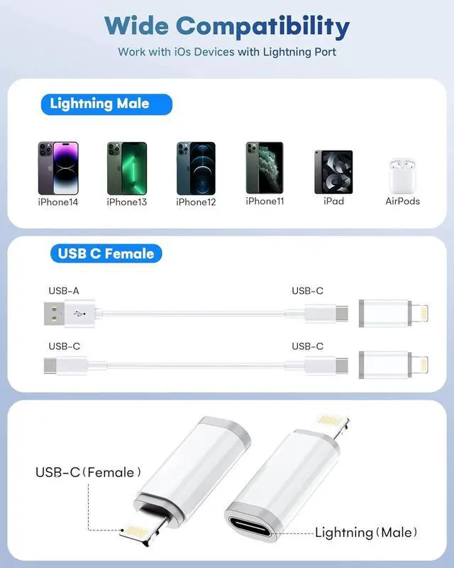 Adapter??: This usbc to lightning adapter is designed for data transfer. The Type C to Lightning cable adapter offers up to 480 Mbps transfer speed enabling seamless data transfer between your iPhone/iPad and computer. It's compatible with a wide range of devices including iPhone 14 13 12 series iPad Pro 10.5 '/ 12.9 ' iPad 5/4 iPad Air 2/Air iPad Mini 3/2/Retina iPod Nano 7 and iPod Touch