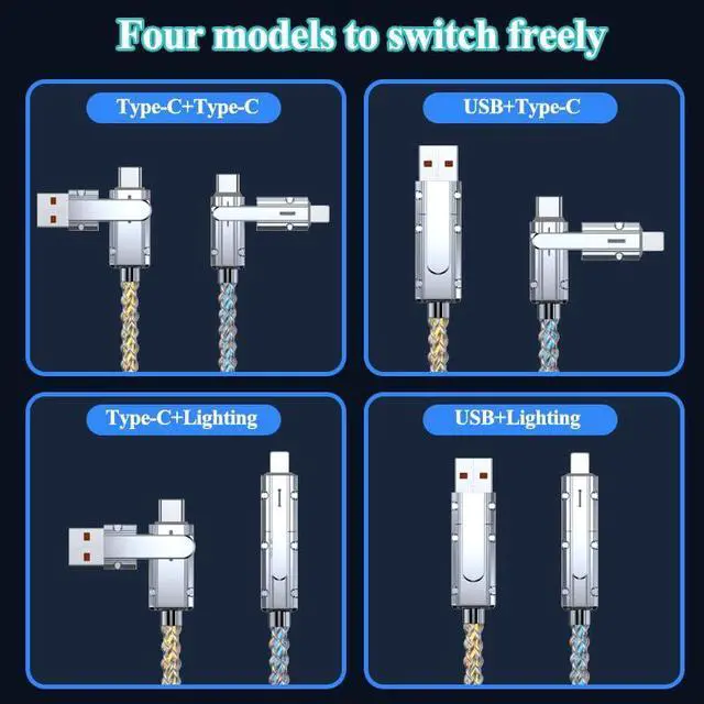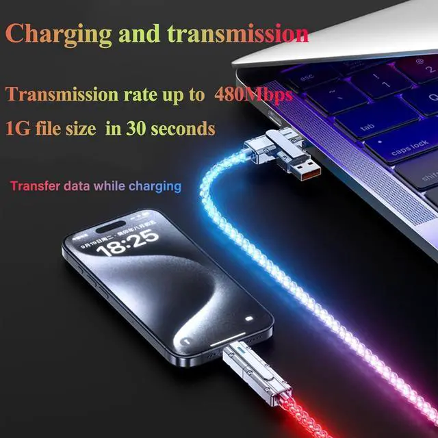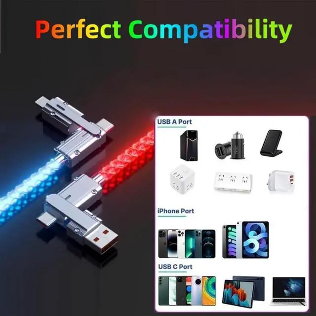 ? 4-in-1 RGB Flowing LED Light UpRGB LED glowing 4-in-1 Colorful LED Light Up Flowing charging cable is compatible with Most Cell Phones port devices. USB+lighting Type-C+Type-C USB+Type-C Type-C+lighting four models to switch freely flowing like stream when it is connected with adapters.? 66W Fast Charging Cable and Data Transfer 66W Light up charging cable adopts pure thick copper inside and smart chips which makes charging speed up 50% than usual charging cable. And it supports data transmission which can reach 480Mbps (Only the type c port supports data transmission).? Enhanced Durability 4 in 1 light up charging cable adopts aluminum alloy shell micro-arc oxidation process.