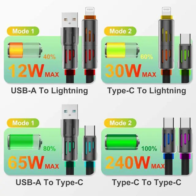 USB C port: Just 60 minutes it can charge your iPhone 16 to 90% S23 to 90% MacBook to 80% and iPad Pro to 89%. Just ensure you're using a compatible USB-C adapter with sufficient power for optimal resultsThe heavy-duty USB-C cable boasts an impressive 20 000+ bend lifespan! Made from food-grade skin-friendly silicone its tangle-free waterproof and easy to clean. The sturdy zinc alloy housing is 1000 times stronger than plastic ensuring consistent and reliable charging every timeEquipped with dual Type-C connectors this premium cable supports up to 240W providing rapid high-speed charging for your devices. And RGB lights on both ports will keep changing colours when charging. It is a soft light not flashing eyes full of gaming atmosphereNOTE! The USB-C Cable Cannot use thick phone cases.