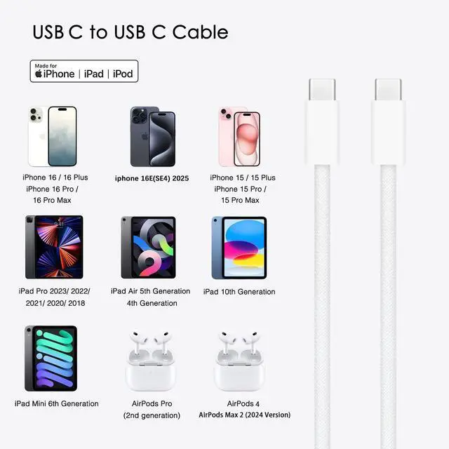 Featuring a White braided design that coils without tangling this 1.5 -meter cable supports Phones IPads and headsets with USB C port. Pair the USB-C Charge Cable with a compatible USB-C power adapter to conveniently charge your devices from a wall outlet and take advantage of fast-charging capabilities. Cable matches the current as your device needs automatically. Multi-function protection technology makes it safe enough to ensure that this Cable and your device are safer to charge at night.