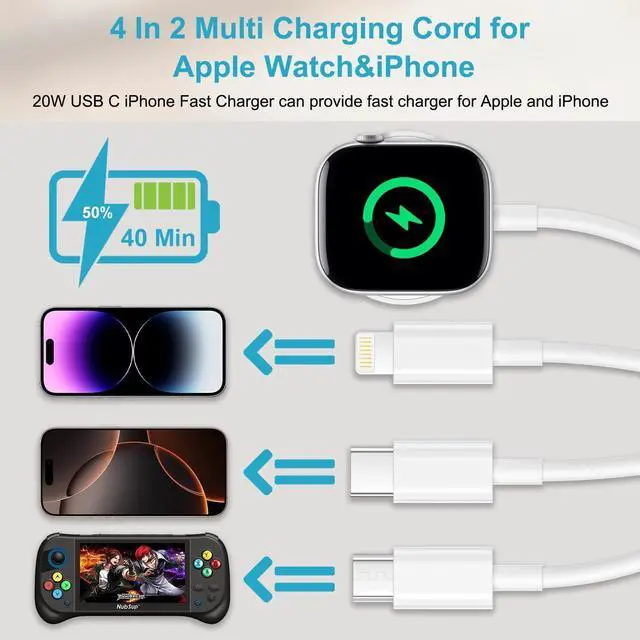 Note: It does not charge through metal or cases thicker than 4mm For better experience we hope you remove the iwatch case. The Watch charger cable is made of high quality ABS+PC and pure copper wire the cable has been tested for 10000+ times of bending. Fast Charging iPhone Watch Charger Time-Saving This magnetic watch charger cord can be used for fast charging your iPhone/watch/Galaxy/Androide devices. Our Smart watch cables & chargers provide a fast charging speed for the iWatch Series. Multi-interface USB iwatch charging cables will save you time! Less time hunting for the right cable and less time charging your cell phone! The magnetic wireless watch charger cable is convenient for office/home/travel/drive. 4FT Watch Charger Fast Charging with 20W USB C iPhone ChargerThis 4 in 1 Watch charger cable has a built-in magnetic charging module which can easily identify your watch with shock absorption and high temperature resistance. You can freely adjust the angle of the watch while charging. To avoid overheating We recommend charging your watch without a case. The multi charger cable for iPhone and watch charger also comes with 20w USB C iPhone fast charger block.