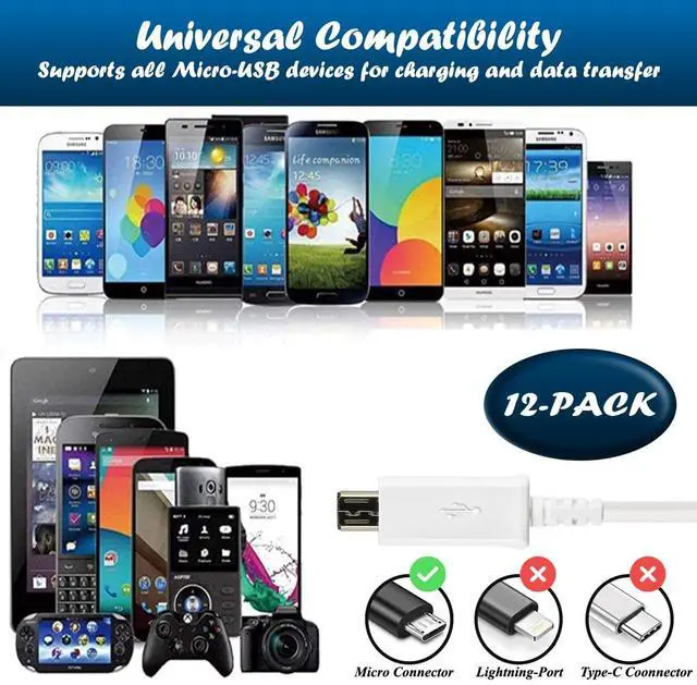 HIGH SPEED SYNC & CHARGE: The reinforced charging cable ensures maximum charging speed for all your devices. Photos videos and all your data could be transferred and synced at ease. Comes with 12-Pack 3.3 ft (1m) of durable flexible cord to suit a variety of everyday connection needsNo more searching for the charging usb cable. Stock up and save with this set of 12 high quality micro usb cable bulk lot.