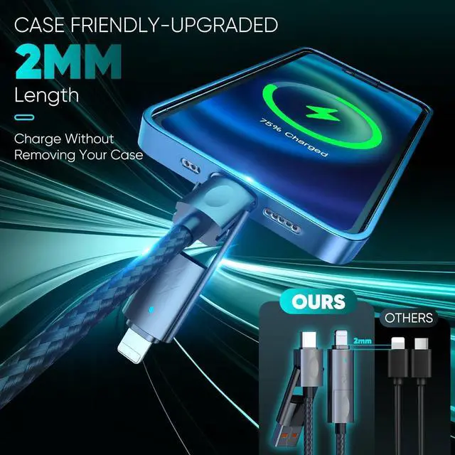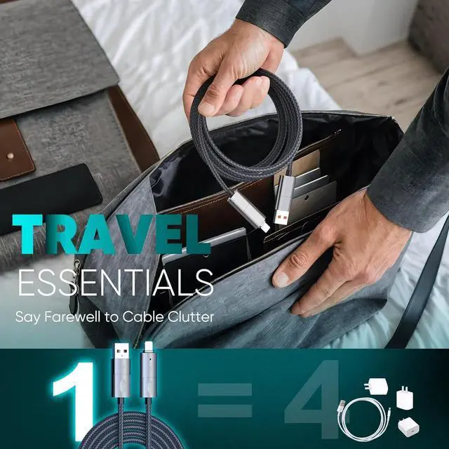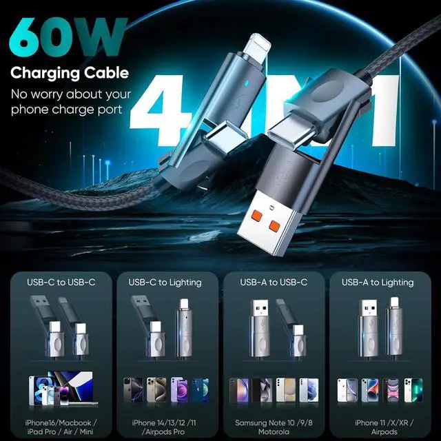 ONE CABLE FOR ALL DEVICES: The usb cables design with four ports-USB A to USB C 60W USB A to Lighting 12W USB C to USB C 60W USB C to Lighting 27W. which offers a complete solution for fast charging and data transfer. no need to carry muiltiple cables for a variety of USB devices. and attached cable tie makes it more convenient to store and travel! 60W RAPID CHARGING & 480Mbps