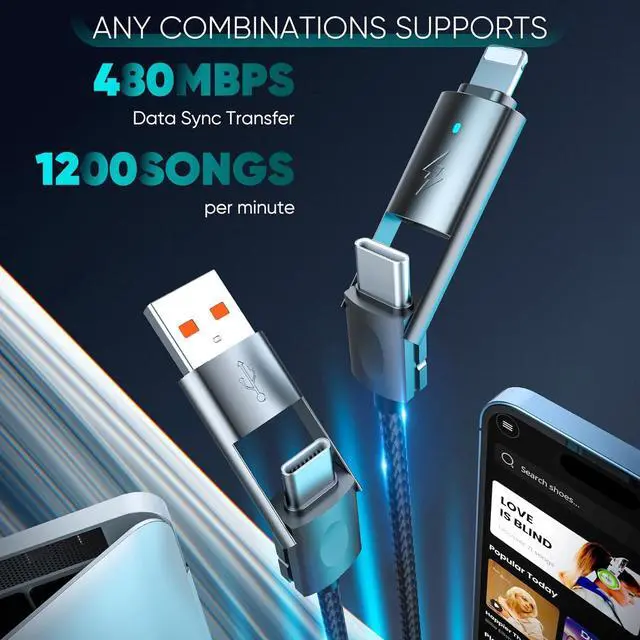 DATA TRANSFER: The 4-in-1 charging cable supports high-speed charging up to 60W when your devices using the usbc to usbc interface and supported type c charger. After testing it can charge your iphone 16 15 from 0% to 83% in just 30 minutes. In addition the data transfer speed for any combination of connectors is 480Mbps which meets your everyday need. (Video/media output not supported)