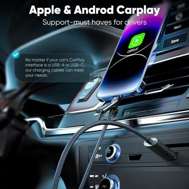 CARPLAY & ANDROID AUTO SUPPORT: The 4 in 1 charging cable is compatible with carplay and android auto system multiple ports allow it adaptor for more cars models and phones. In order to be perfectly compatible with most phone cases we intentionally designed a 2mm connector extension allowing for convenient charging without the need to remove the phone case. 10FT LENGTH &SYNTHETIC