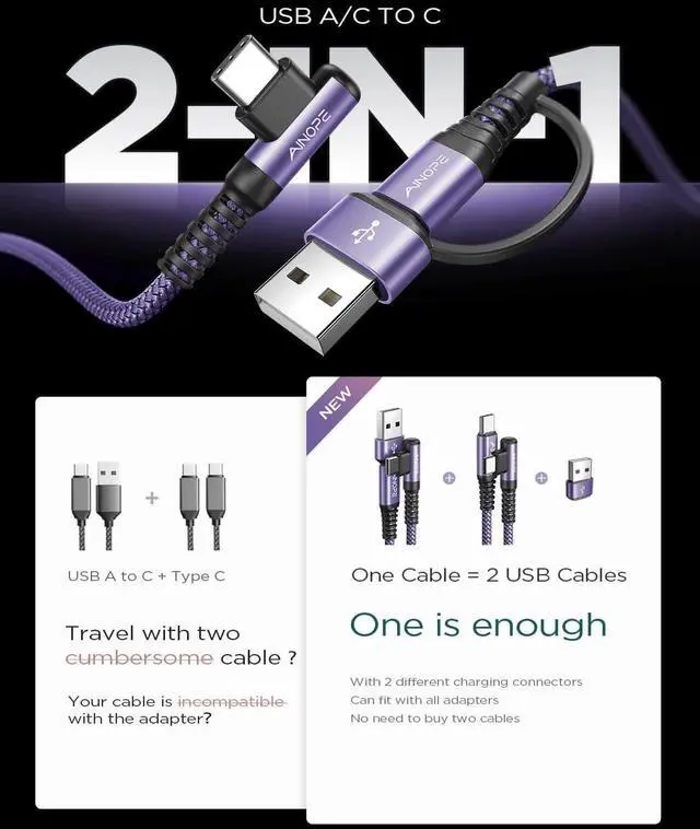 USB A/C Cable: this won't get in your way even while charging playing games watching videos and reading e-books. Right Angle Design 2-in-1 fast charger USB A/C to USB C cable can effectively avoid the bending of the cord end and extend the life of the charging cable. Its user-friendly design more convenient and comfortable for playing games watching videos and reading e-books when you chargingEnhanced