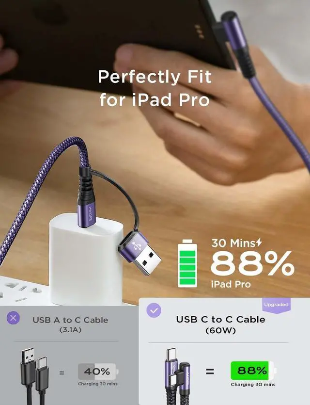 Cable Durability: USB to USB C Cable for ipad pro charger has electronic safety certifications that comply with appropriate standards it built-in laser welding technology which ensure the metal part won't break. The longer SR anti-break design enhances the durability of the cable. With 40 000+ times bend test the flexible and durable double-braided nylon type c super fast charger longer service life and will never rupture