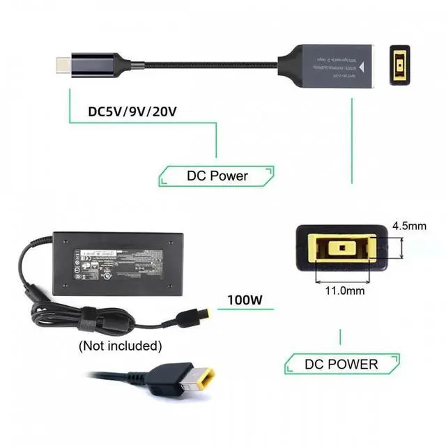 Rectangle Jack Thinkpad X1 Input to USB-C Type-C Power 100W Charge Cable for Laptop Phone PD9V 5V 20V
