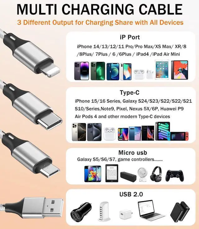 Charger Cable: The multi charging cable is unique brings you convenience and sharing feeling. 3 charging tips in 1 cable make the phone charger simple lightweight and portable. You can carry this multi charger cable anywhere perfect for home car office travel dock or sharing with friends. A must have for Uber/Lyft drivers.?