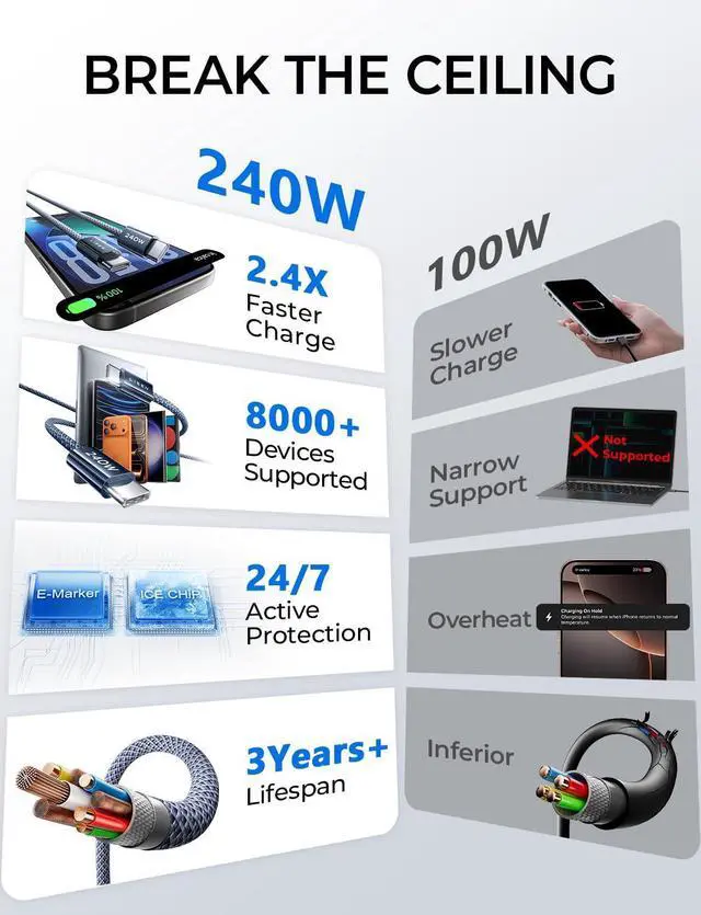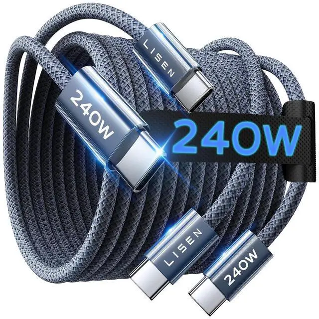 Every Device]: 240W doesn't mean compromising safetyit means unmatched versatility. Thanks to PD 3.1 Extended Power Range (EPR) technology our c to c cable fast charging dynamically adjusts voltage/current to deliver each device's maximum safe power (e. g. 60W to iPads 100W to older MacBooks 140W to MacBook Pro M5). Other 60W/100W usb c to c cable can't hit full charging speed for your power-hungry devicesthey're held back by their own power limits. LISEN 240W usb-c charge cable? It charges all your gear steadily efficiently and at full speed with zero safety risks[240W Ultra Fast Charging | Smart Protocol Matching] This iphone 17 charging cable upports PD 3.1 EPR/QC 4.0 fast charging up to 240W Max working seamlessly with USB-C Power Delivery adapters (e. g. 60W/100W/240W). It automatically matches your devices handshake protocol to deliver the maximum safe power it can handleno guesswork just the fastest possible charge for each gear. It's 2.4X faster than a 100W fast charger usb c cable: Up to 80% charged in 30 mins for iPhone 17 Pro Max Up to 65% charged in 30 mins for iPad Pro M5 and up to 80% charged in 30 mins for MacBook Pro M5. This fast charging cord type C balances speed and protection perfectly giving you both fast and secure charging[E-Marker 3.0 Chip |