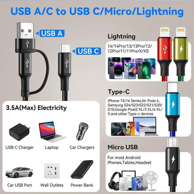 Universal Compatibility: Compatible with iPhone 17 Air/ 16 15 14 Plus/ 17 16 15 14 13 12 11 Pro Max/ 17 16 15 14 13 12 11 Pro/ 14 13 12 Mini/ SE/ 17 16 15 14 13 12 11/ XS / XS Max/ XR/ 8/ 8 Plus/ 7/ 7 Plus iPhone 6s/ 6s Plus/ 5/ 5s/ SE iPads Pad 4 Pad Air Pad mini Pod. USB type c connector supports to the Galaxy UItra/ S25+/ S25/ S24+/ S24/ S23/ S22+/ S22/ S21+/ S21/ S20+/ S20/ 210+/ S10/ S9+/ S9/ S8+/ S8 Note 9/ 10/ 20 Nexus 5X Nexus 6P LG V30 V20 G6 G5 Pixel/ Pixel 2 XL HTC ZUK Z1 Lumia 950 Lumia 950 XL N1. Micro USB port for Galaxy S7/ S6/ S5 most Android phones Kindle tablets Bluetooth headset external batteries PS 4 5 controllers and more.