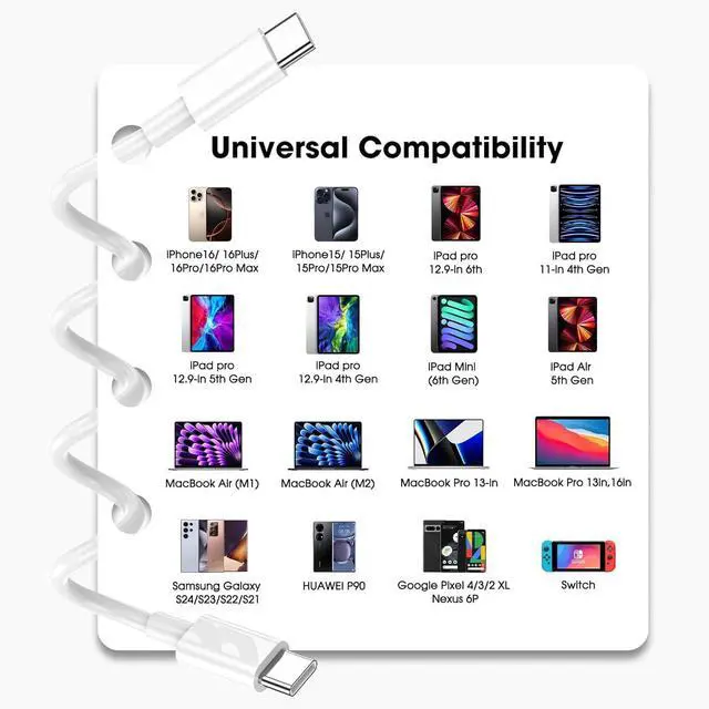 [60W USB C to USB C Fast Charging Cable] Deliver up to 60W (20V/3A) of power with support for PD 3.0 and QC 3.0. Quickly charge your iPhone 17/16 series (including iPhone 17 Pro and iPhone 17 Air) iPad Pro MacBook Air and more. Also supports data transfer speeds up to 480Mbps. [iPhone 17/16 Pro Max/Plus Compatible Cable] Designed for the latest USB-C devices fully compatible with iPhone 17/17 Pro/17 Pro Max/17 Air 16/16 Pro/Pro Max/Plus 15/15 Pro/Pro Max/Plus iPad Air 4/5 iPad Pro 11/ 12.9 and MacBook Air/Pro. One cable for all your USB-C device needs.