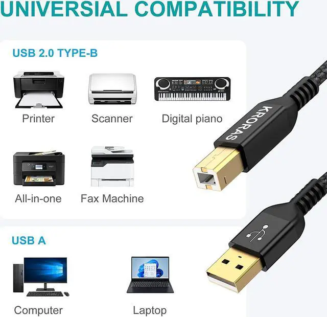 REINFORCED SR JOINT DESIGN: KRORAS printer usb cable with test of 20 000+ bend the usb b cable special SR design makes the usb 2.0 printer cable joints more durable. The flexible and wear-resistant armor nylon braided material offers stronger protection.