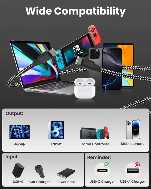 Charger Only: This USB C to USB C cable only works with USB C chargers and is not compatible with USB-A chargers60W