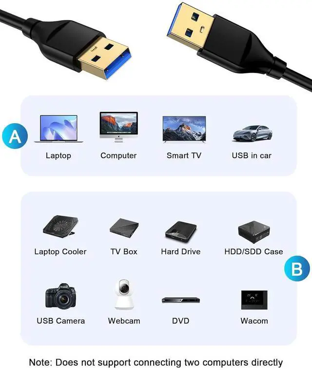 Wide Compatibility: The USB A to USB A cable is designed for extensive compatibility connecting a variety of devices including monitors hard drives laptop cooling pads cameras DVD players flashlights Blu-ray drives set-top boxes and 2.5 -inch external hard drive enclosures with Type A ports. It is fully compatible with USB 2.0 and 1.1 ports. This USB to USB cable provides versatile connectivity making it suitable for both daily use and professional tasks.
