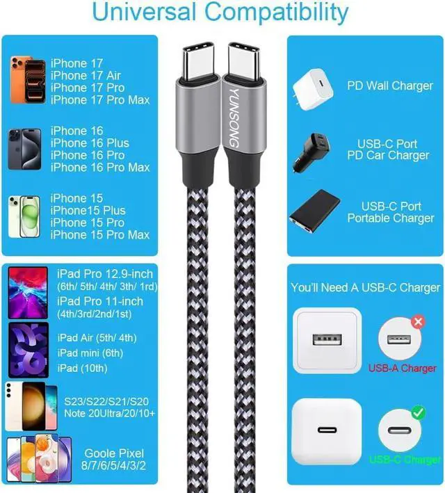 Perfect Match all PD USB C Charger Widely Compatible With iPhone 17Pro Max/17Pro/17Air/17 16Pro Max/16Pro/16Plus/16 15Pro Max/15Pro/15Plus/15 MacBook Air Mac Book Retina 12 inch 2023 2022 2021 2020 2019 2018 MacBook Pro 13 14 15 16 inch iPad Pro 12.9 inch (6th 5th 4th 3rd 1st) iPad Pro 11 inch (4th 3rd 2nd 1st) iPad Air (5th 4th) iPad Mini 6 iPad 10th and any USB-C DeviceThe Cable has a Strong Nylon Braided Design with Premium Aluminum Housing and Sturdy Nylon Fiber Cover Adds Premium Durability to the Cable Which Makes it Easily Survive Everyday Usage and Gives it a More Stylish and Elegant Appearance that Goes Great with Your Expensive Gadgets.