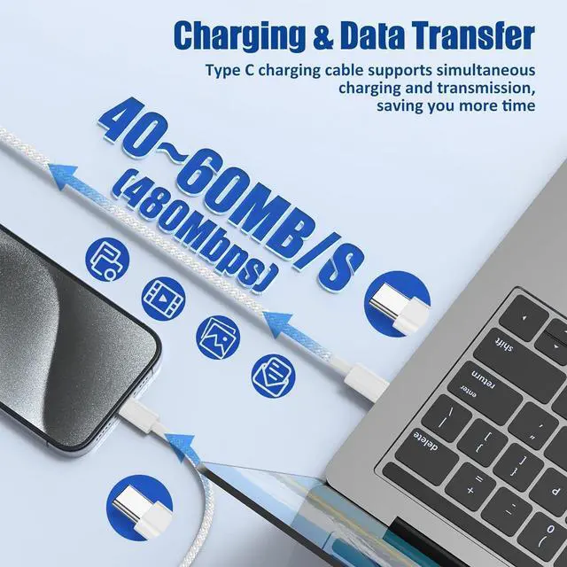 60W iPhone 17 16 15 Fast ChargingThis iPhone 17 16/15 charging cable has a power of up to 60W (20V/3A) supports PD 3.0 /QC 3.0 /QC 4.0 fast charging and can be used with a USB-C power adapter such as 20W/30W/45W/60W. Our USB C fast charging cable output charges your devices 35% faster than other 5V/2. A output cables. You can save more time as the data transfer speed can reach 40~60MB/S (480Mbps) Durable Braided DesignFor safer and more reliable charging this USB C to C cable adopts advanced braided shell and the latest trend C-type interface.