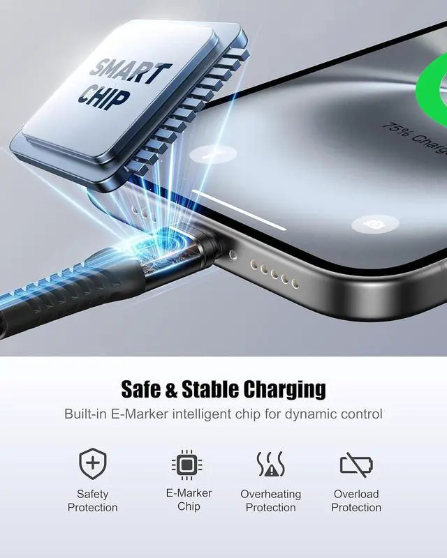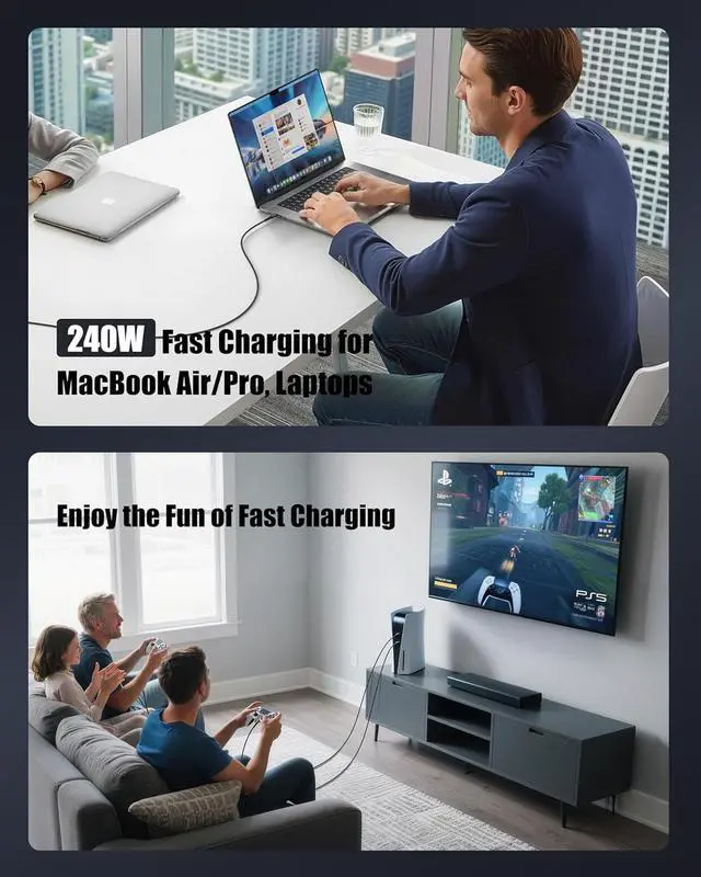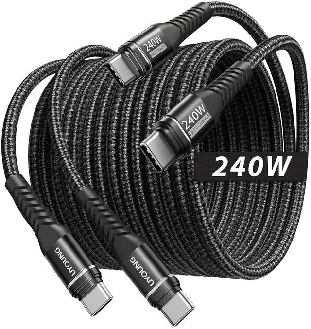 [Certified Smart USB C Charging Cable] This USB C cable uses PD 3.1 Extended Power Range (EPR) technology to achieve 240W high-speed charging and is backward compatible with 140W/100W/60W electronic devices. Upgrade the intelligent E-Marker chip to dynamically adjust while providing efficient power supply actively reduce current and avoid equipment damage due to overheating and overload. The braided USBC Cable is compatible with CarPlay and Android Auto and its 6-foot length is just right for charging the front and rear passengers of the car. [240W Fast Charging and Data Transfer] The USB C to USB C cable supports PD 3.1 /QC 4.0 and provides high power of 240 watts working well with 200W/170W/140W/100W/60W power delivery adapters.