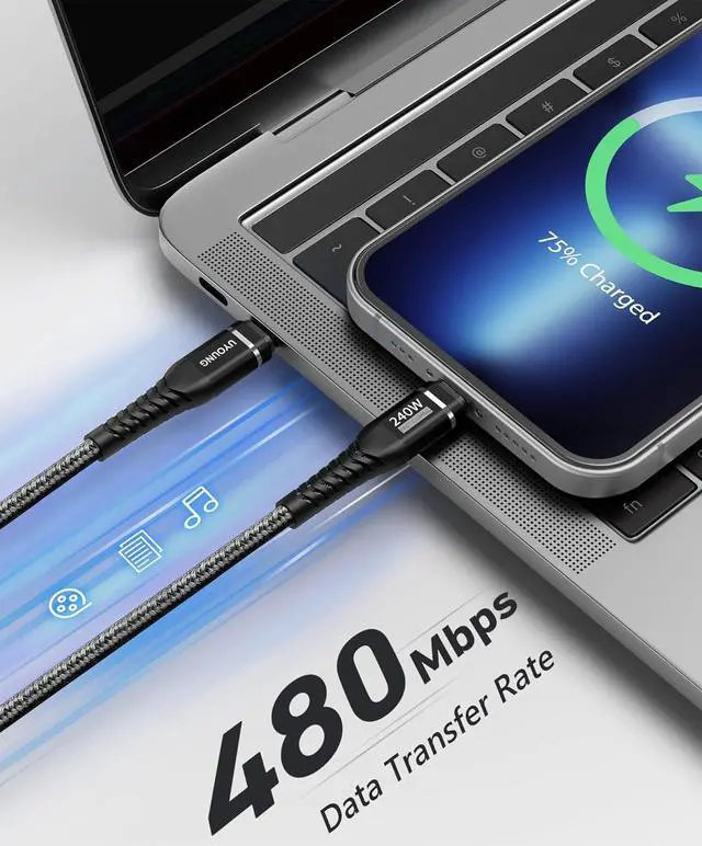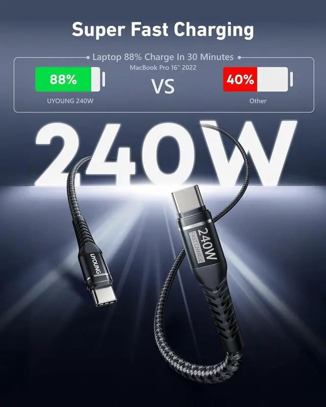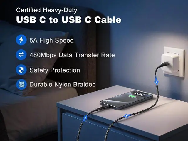 Provides breakthrough 48V/5A performance charging the MacBook Pro 16 88% in 30 minutes and enjoying the ultimate fast charging experience. Up to 480Mbps data transmission efficiency fast transfer of files photos music and videos. Charge your phone and laptop simultaneously with two cables on the couch in the office gym hotel or while traveling. [Ultra Durable Braided USB-C Cord] The USB C cord uses advanced reinforced welded connectors and has passed over 20 000+ bending tests making it less prone to breakage loosening or detachment. Made of high-quality nylon weaving the USB-C to USB-C Cord is soft and tough capable of withstanding a tensile force of 150 pounds resisting pet bites or squeezes and will not deform or break.