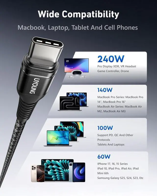 Its strength is three times that of standard cables and its lifespan is twice that of ordinary cables in extreme daily use. No tangles easy to charge anytime anywhere. [Widely Compatible with Type-C Devices] The USB Type C charger cable supports charging cell phones laptops tablets and other Type C devices. The Type C to Type C cable is compatible with iPhone 17/17 Pro/17 Pro Max 16 15 series; iPad Pro 13 M4/11 M4/Air M3; MacBook Air/Pro; Galaxy S25/S24/S23; Surface Pro 11/10; XPS 17/15; ROG Zephyrus G16; Blade 16; DJI Mavic 4 Pro/Air 3; Kindle 11/Paperwhite 6; Power banks controllers and Android phones and most electronic devices etc.
