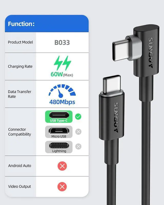 Note: does not support video output. 90 Degree Angle PlugSUNGUY USB C to USB C cable with innovative 90 degree design is much more convenient and comfortable for playing games watching videos reading e-books when lying on the couch or in bed while charging. Safe & ReliableThe 90 degree cable ensures reliability and durability. Double-sided USB-C connectors with overmoulded strain relief designed for frequent plugging and unplugging provide a charging cable with reliable performance and longer life. Wide CompatibilityThe USB C to USB C cable is compatible with iPhone 16/16 Pro/16 Plus/16 Pro Max/15/15 Plus/ 15 Pro/ 15 Pro Max iPad Pro 2020 2018 MacBook Pro 2020 2019 MacBook Air 2020 2019 XPS13 XPS 15 XPS 17 MateBook X Pro MateBook D P20 Pro P20 Mate 20 Pro HP EliteBook Chromebook Swift 5 Aspire E 15 Google Pixelbook Pixel 3 3 XL Pixel 2 XL Surface Go 2 Surface Pro 7 and other USB 2. 0/ 3.0 USB-C devices. What You Get You will receive 2pcs 2FT 90 degree USB C to USB C cable. Enjoy 12 months worry-free warranty and all questions answered within 24 hours by SUNGUY customer service.