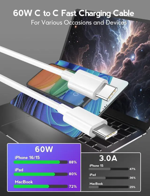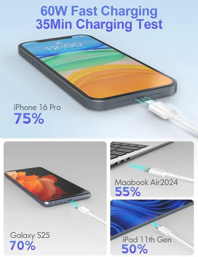 Fast Charging & Sync: Supports PD 3.0 /QC 3.0 /QC 4.0 maximum 60W (20V/3A) fast charging. If using a PD45W or higher charger with this USB C to USB C Cable it only takes 20 minutes to charge the iPhone 17 from 0% to 50% and 35 minutes to charge the Galaxy S25 Ultra from 0% to 80%. The data transmission speed is as high as 480Mbps.