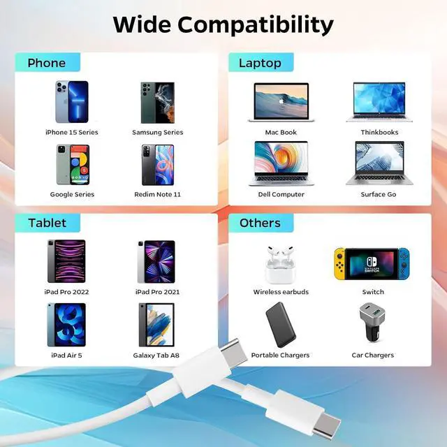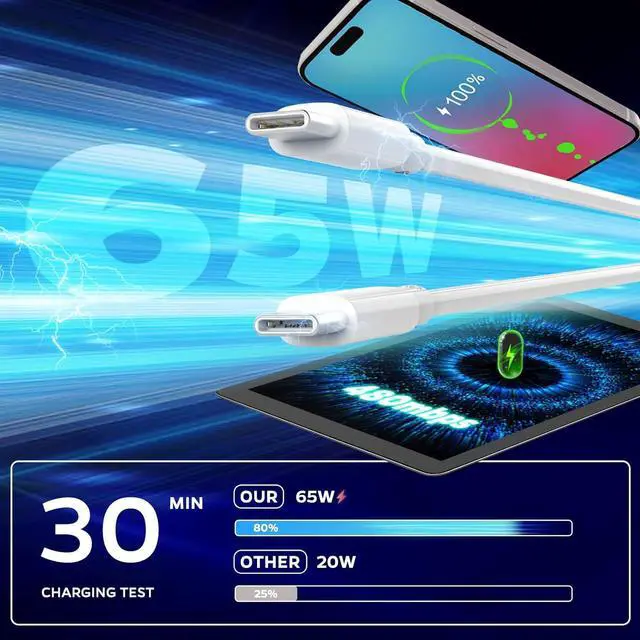 Stay charged up and connected with this high-quality USB C to USB C cable. Power up your devices at lightning speed with 65W charging support and experience rapid data transfer speeds of up to 480Mbps. Built to last this cord features durable TPE material construction. Enjoy seamless connectivity and universal compatibility with various devices including iPhone 15 and other USB-C enabled gadgets. With a convenient 3.3 ft length this cable offers flexibility and convenience for daily use. Its compact design allows for easy storage and portability making it the perfect accessory for home office and travel.
