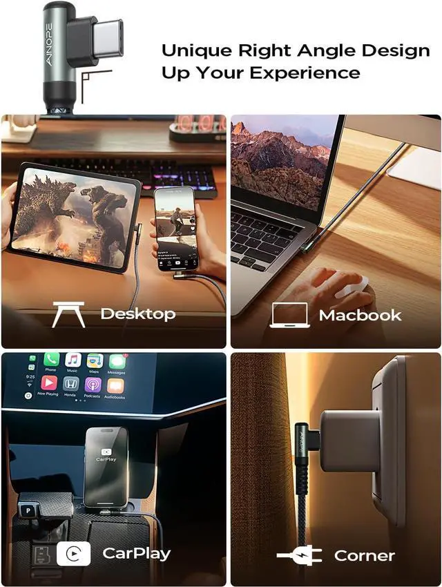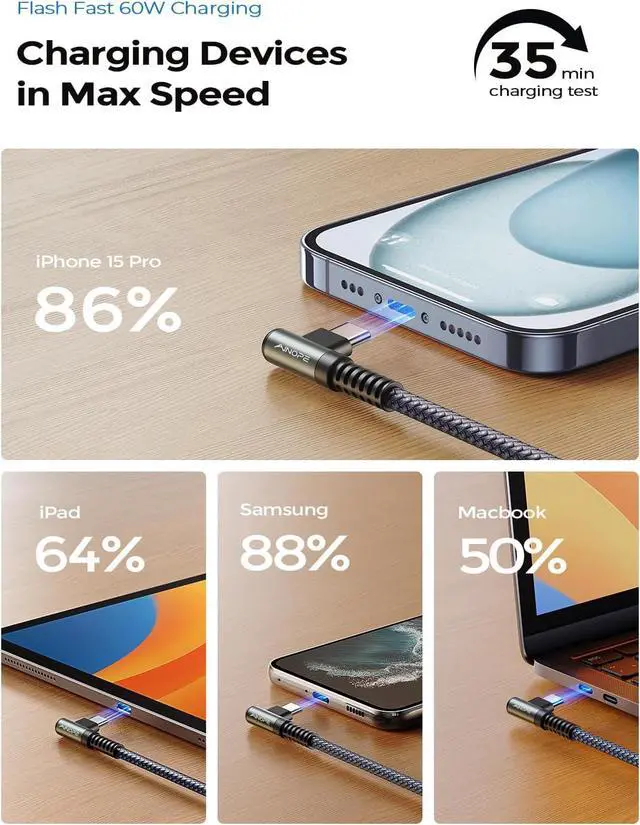 DURABILITY]: Reinforced 90 degree USB C cable with special SR joint Lasts 30x longer than ordinary cables-proven in a laboratory environment to withstand 40000 bends. It built-in laser welding technology which ensure the metal part won't break. One of the toughest cables ever created with tensile strength capable of withstanding 175 lbs[PERFECT