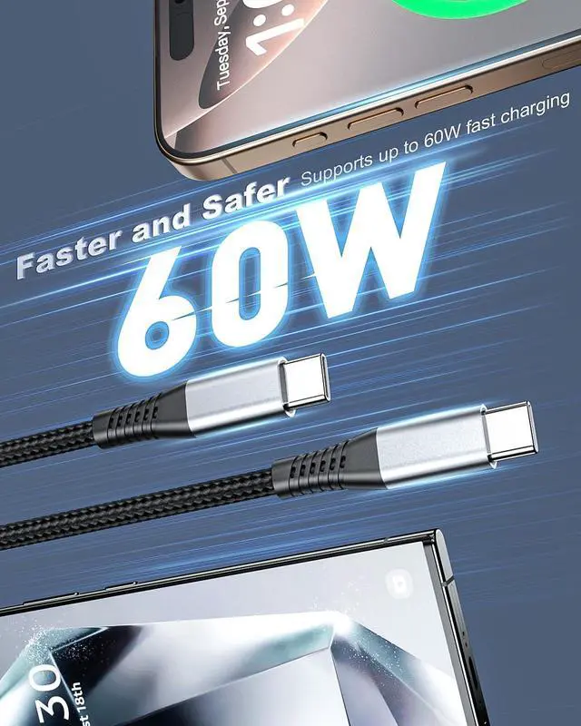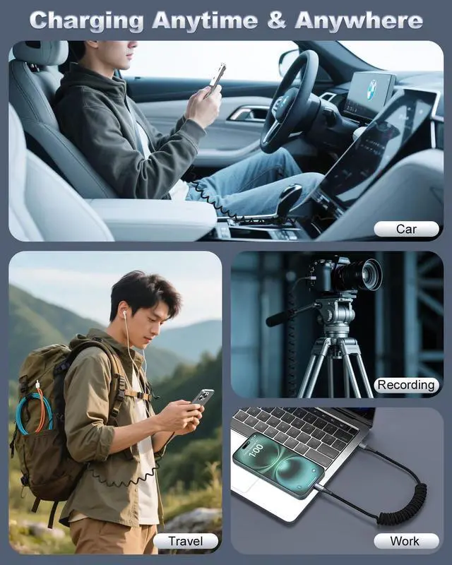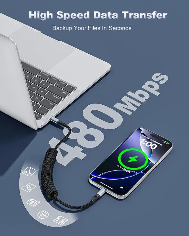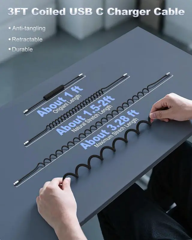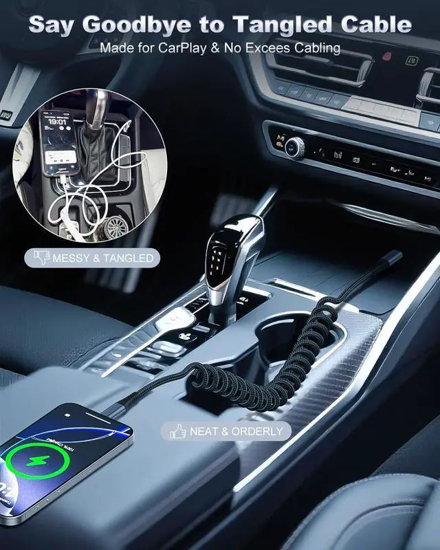 Coiled USB C to USB C Cable This fast charging usb c cable features a retractable coil design which shrinks to only 1.5 ft for easy storage and can stretch up to 3.28 ft for free access inside the car. Say goodbye to the troubles of traditional data cable entanglement and knotting and make the space of your car cleaner. Fast Charge & Data Transfer Supports PD 60W high-power fast charging. This MFi certified Type-C Cable provides safe and stable fast charging for the device. Supports a data transfer speed of 480Mbps. While ensuring stable data transmission it is perfectly compatible with the CarPlay in car system.