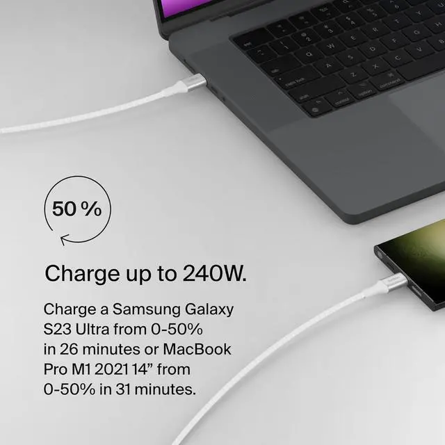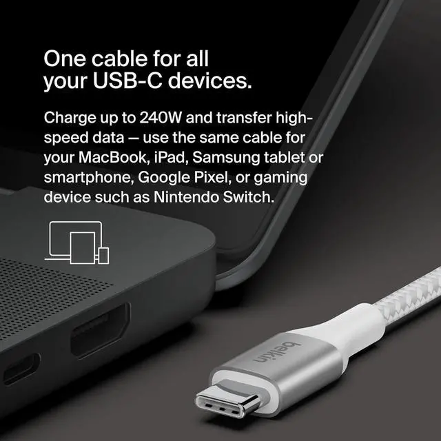 OPTIMAL CHARGING SPEEDS: Our BoostCharge charging cable supports fast charging up to 240W for laptops tablets and smartphones. Fast charge a MacBook Pro 14 from 0-50% in just 31 minutes as well as iPad Air 5 S25 Nintendo Switch 2 and more at optimal speeds.