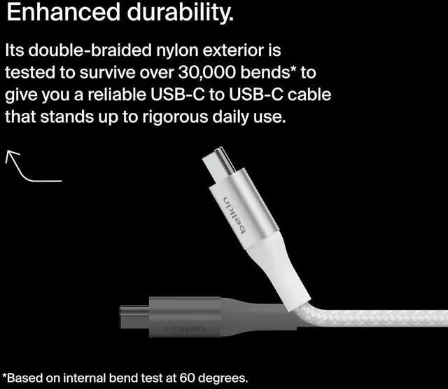 MADE TO LAST: This USB-C to USB-C cord is designed for lasting use with a durable anodized aluminum cable head and double-braided nylon cable design that's been tested to survive over 30 000 bends and 10 000 plug-ins.