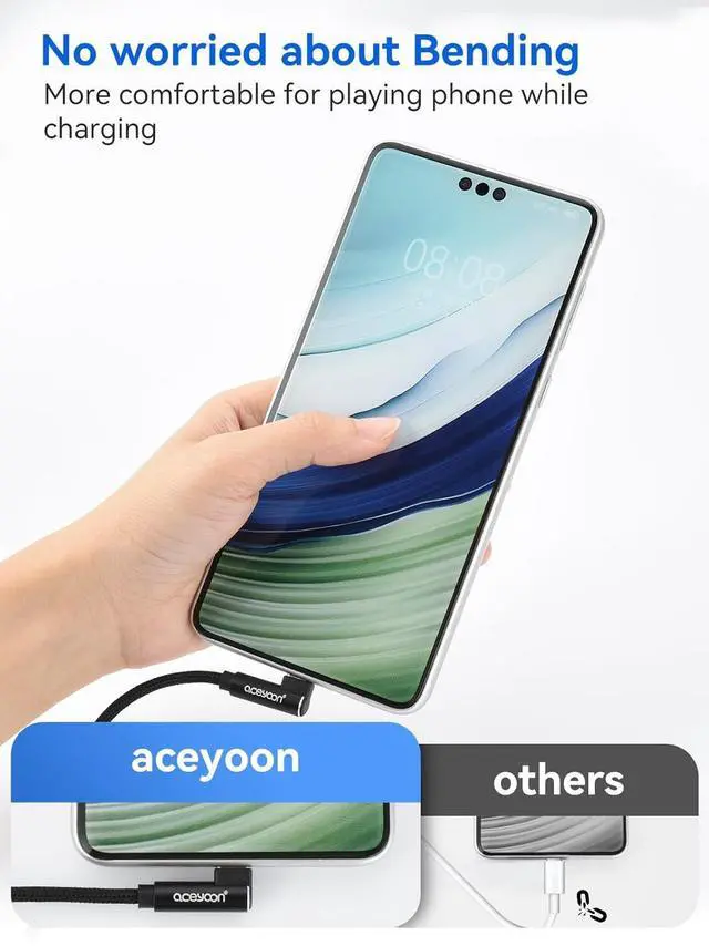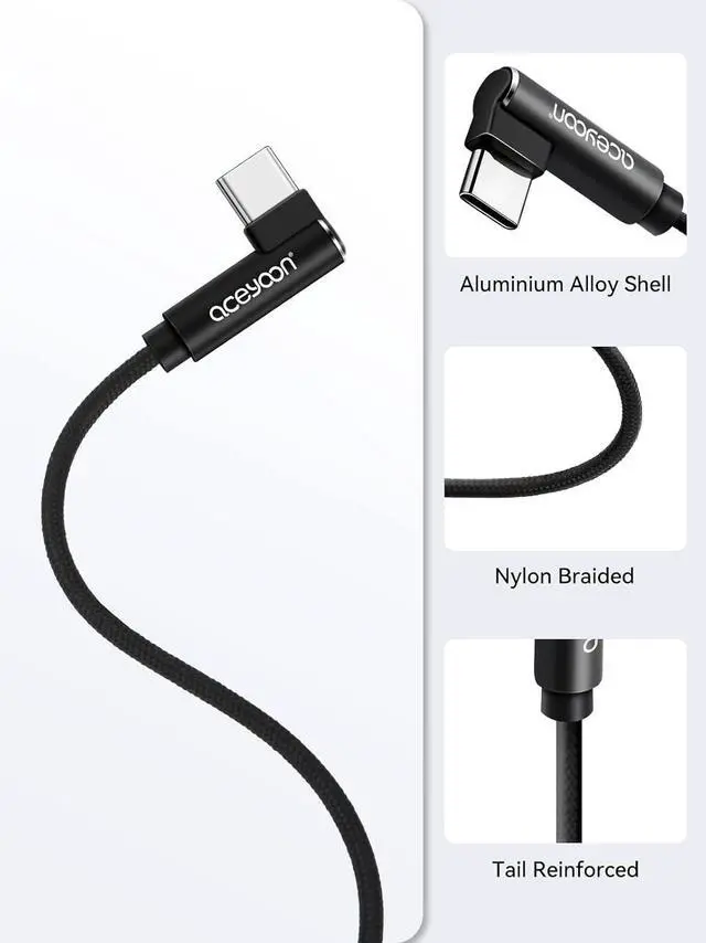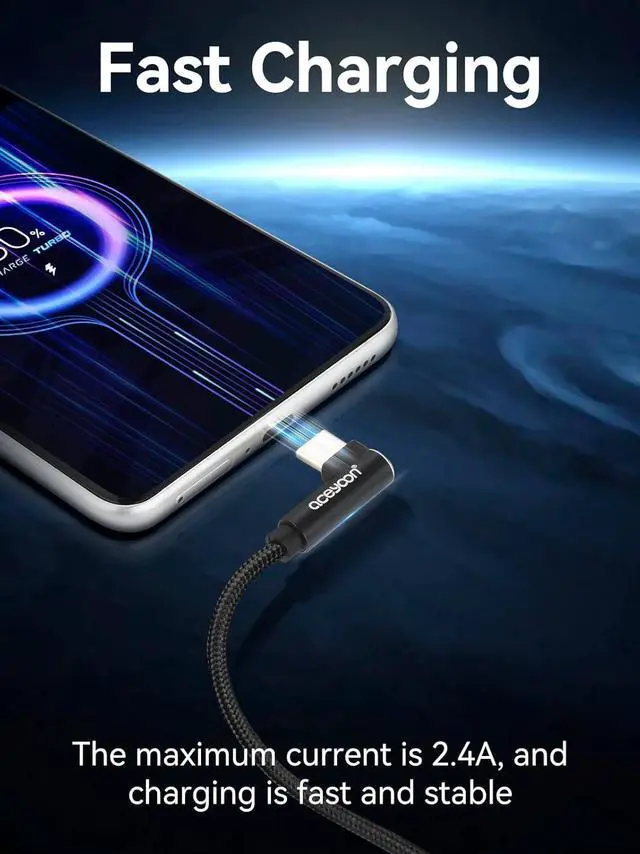 USB C Cable: 90 degree angle design corresponds to ergonomics which is very suitable for play mobile games while charging mobile phones. If you play video games or watch films it is more convenient to charge your phone without bending cables.