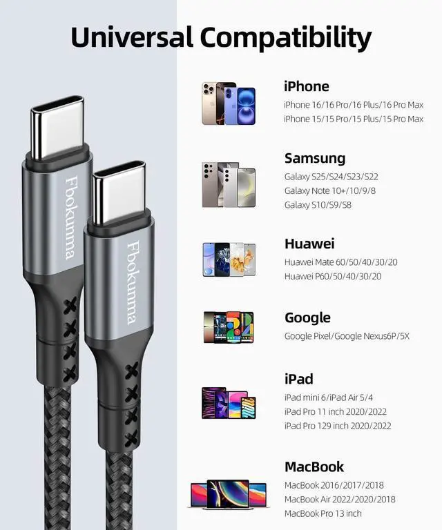 Compatibility: Fbokunma usbc to usbc cable is compatible for iPhone 16 15 for MacBook for iPad for Galaxy S24 S24+ S24 Ultra S23 S22 S21 S20 A54 A53 A15 A14 Note 20 10 Z Flip/Fold 6 5 4 3 for Pixel 9 8 7 6 5Package included: You will get 4 pack 8inch/ 0.6 ft durable USB C to USB C Cable