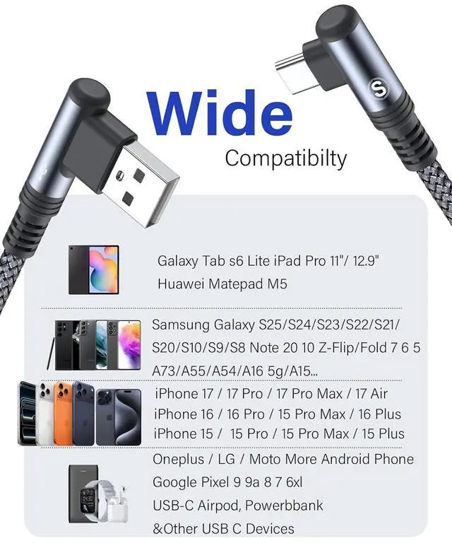 Universal Compatibility: USB Type C cable Fast charging Compatible with iPhone 17 / 17 Plus / 17 Pro / 17 Pro Max / iPhone air/ iPhone 16 / 16 Plus / 16 Pro / 16 Pro Max / iPhone 15 / 15 Plus / 15 Pro / 15 Pro Max/ Galaxy S25 S24 23 S22 S21 S20 S10 S10e S9 S8 Plus/FE/Ultra Note 20 10 9 8 A73 A72 A71 A54 A53 A52 A51 A50 A42 A33 A32 A23 A22 A21 A20 A14 A13 A12 A11 A10e A03S A02S Tablet S8 S7 S6 Kindle Fire HD 10 8th Google Pixel LG Moto G PS5 Controller & More USB-C devices. WARRANTY&RETURN or REFUND is