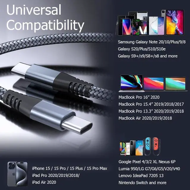 Universal Compatibility: Type C Charging Cable work with all Type-c devices such as for iPhone 15/15 Pro/15 Plus/15 Pro Max Galaxy S20/S20+/S10/S9 Note 10 iPad pro 2020/2018(11/ 12.9 ) Macbook Air 2020/2018 Macbook Pro 2020/2019 Google Pixel 4/3/3a/2 XL and other c port devices.