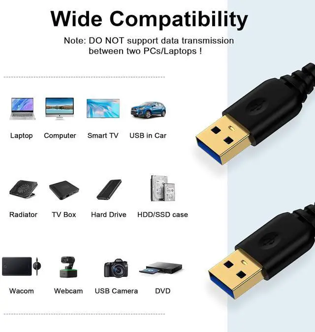 USB Cable: USB 3.0 male to male cable has two USB A ports on both ends usb cable allow you to connect two devices at the same time. usb a to usb a cable is suitable for data syncing with USB-A devices including external hard drives USB hubs automobile Bluetooth speakers smart TVs set-top boxes monitors Windows PC desktops laptop coolers DVD players cameras set-top boxes and blue-ray drives.