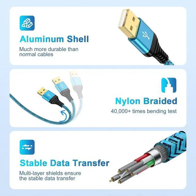 USB-A Cord: With the 10ft long usb a male to male usb cable you can connect your devieces wherever you want. Made of reinforced SR design using TPE material can withstand 40 000+ bending tests which effectively protects double usb a cord from breaking. Premium metal zinc alloy connectors made nylon braided usb type cord without tangle more durable with best price for long life usage. Power Output for your