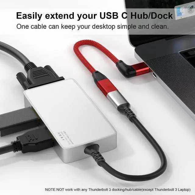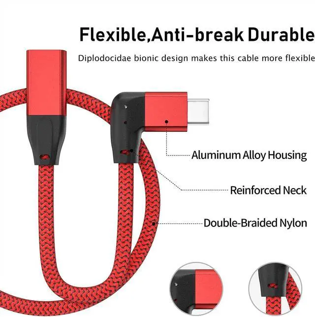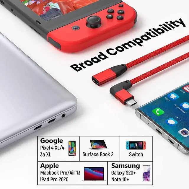 New Right-angled USB-C Extension Cord--Innovative 90 degrees L design Protect the plug and extend the life of cable by reducing the strains of everyday use. The USB-C Extensions extend the reach of your existing USBC cables which makes it easier to connect devices for greater convenience; Support charging and data transmission for audio or video (4K). This Male to Female USB C Extender supports Power Delivery up to 100W providing the fastest possible charging for your devices. Data transfer speeds up to 20 Gbps allowing you to transfer bulky files like an HD video in seconds.