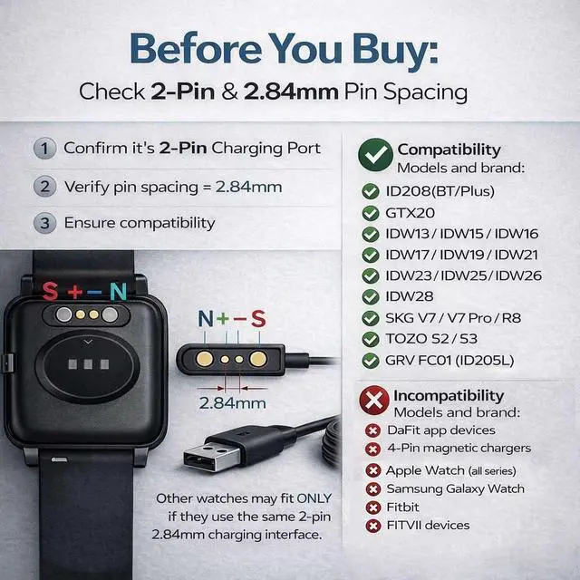 Interface: Fits selected models such as SKG V7/V7 Pro/R8 TOZO S2/S3 GRV FC01 (ID205L) Letsfit ID205L/EW1/IW1 YAMAY 021/023 Willful SW023/SW025 ONLY if they use the same 2-pin 2.84 mm charging interface. Please check the charging port before ordering.? NOT Compatible (Avoid Wrong Purchase) NOT compatible with DaFit app devices NOT compatible with 4-pin magnetic chargers NOT compatible with any pin distance 2.84 mm NOT compatible with Watch (all series) NOT compatible with Galaxy Watch NOT compatible with Fitbit FITIIV devices. Stable Magnetic Charging & Safe Use Magnetic alignment helps attach securely for stable charging. Recommended to use a 5V 1A USB power adapter for safe and steady charging. What You Get & Support Includes 1× USB charging cable.