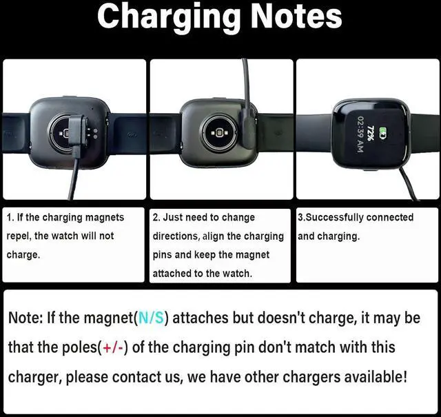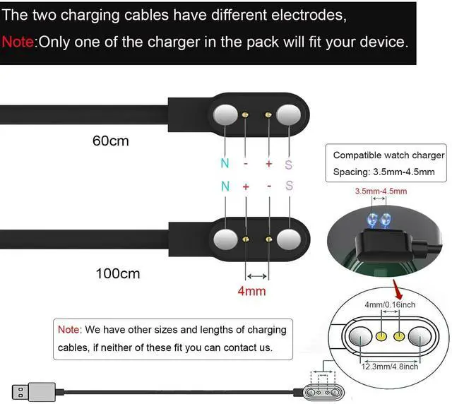 IMPORTANT! Reading before purchasingThese two cables charging pins sapcing are 4mm Please measure the distance between the charging points on the back of the watch to select the correct one. If you need a larger or smaller spacing size please contact Xininyia customer service. IMPORTANT! Reading before purchasingTwo cables called Model A and model B Length 1m and 60cm which are of different polarities. At least one will fit you smartwatch(PREREQUISITE: Spacing is correctly selected). So if you want to get it right the first time This is a good choice. Short-Circuit ProtectionMultiple protection mechanisms such as short-circuit protection over-voltage and over-current protection effectively prevent the battery from overheating and damage. Stable and DurableMade of ABS material and flexible PVC. The charger cable has been tested for bending over 5000+ times. Portable and ECO-FRIENDLYThe charging cable is designed to be lightweight and portable so it can be put into your travel bag and carried around. Adopting high efficiency conversion circuit and low power standby mode reduces energy consumption minimizing energy waste and carbon emission.
