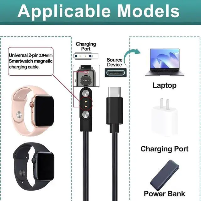 Wide Device Compatibility Replacement charger for smartwatches and fitness trackers with 2.84 mm 2-pin magnetic interface. Supports models ID205L ID205S ID205U SW021 SW023 SW025 ID206 ID216 Uwatch 3S Urun Urun S GT01 CT4 V7 BV-SW01 and more. Precision 2.84 mm Pin Spacing Universal smart watch charger Designed specifically for watches using 2.84 mm center-to-center distance between charging contacts. Accurate fit ensures stable connection and safe charging. Measure your watch contacts before ordering for compatibility. Strong Magnetic Connection Smartwatch charger magnetic Built-in strong magnets and pure copper probes auto-align with watch charging points reducing accidental disconnections.