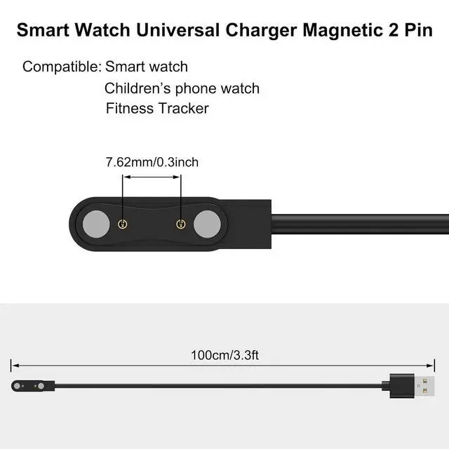 Output: 5V 1A 5W 3.3FT smartwatch charger power cord. The distance between the two points at the center of the charging contact is 7.62 mm. (NoteBefore purchasing smart watch chargers Please ensure that the distance between the two contact pins is 7.62 mm)Durable